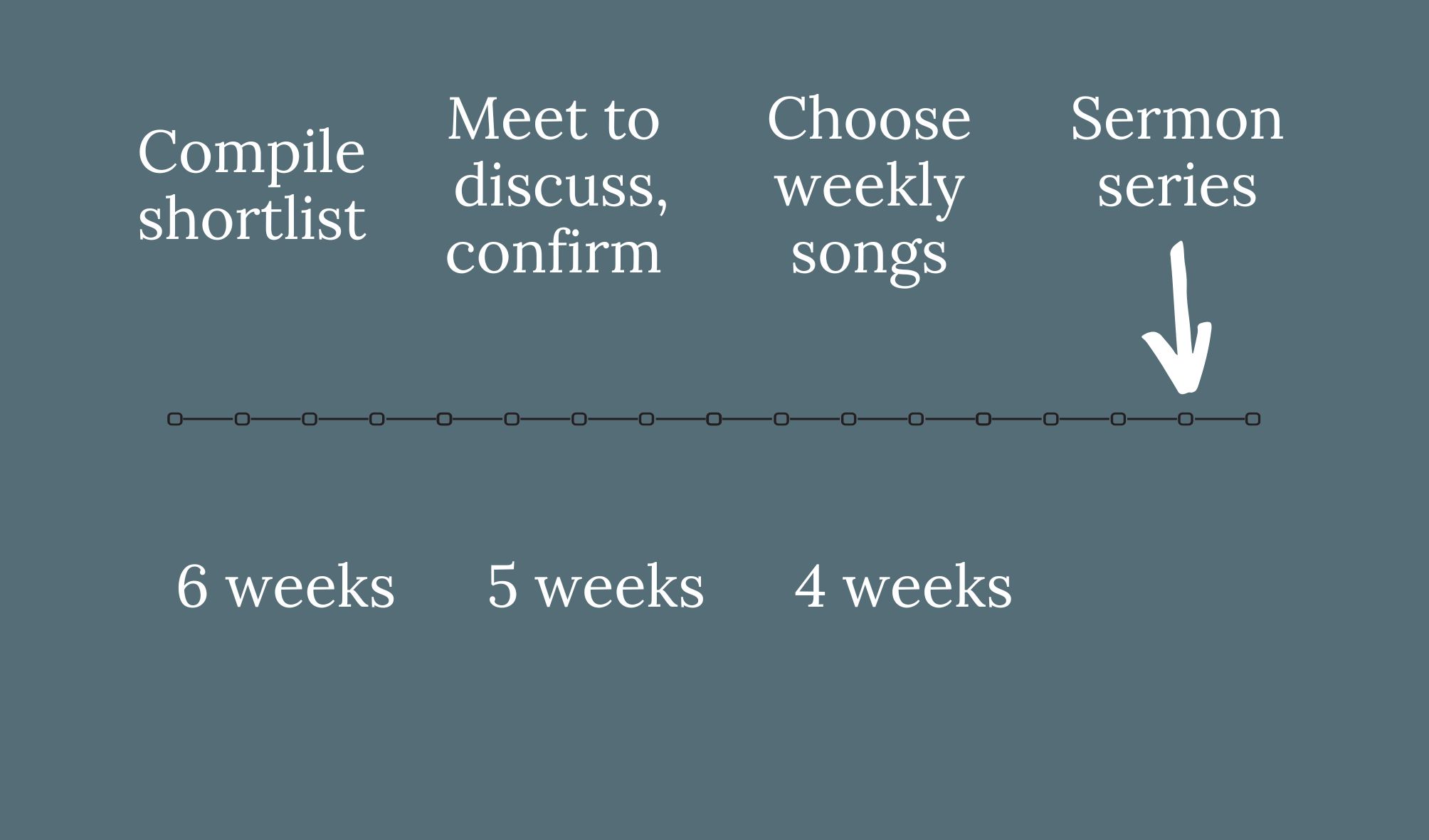 The timeline above aims to do two things. First: give the wider worship team as much time as possible to become familiar with and learn the upcoming songs (this may also apply to the whole church, listening to the church playlist on Spotify, for example). Second: to do the song choosing in periods with boundaries, rather than choosing songs every week throughout the series, with no end in sight (which can become relentless). This approach has many strengths in the areas of organization and forethought. In addition it can free up members of the SCT (particularly myself) to give attention to other areas of ministry when song choosing is done (ministry wide work/events, training, workshops, rehearsals, etc.)